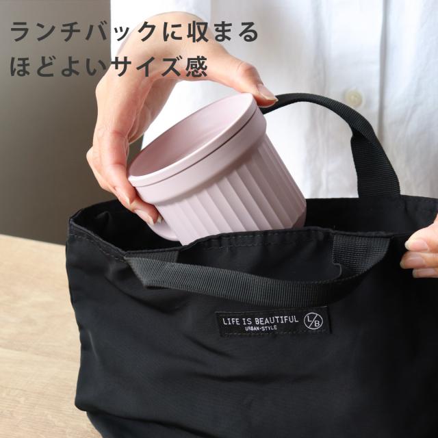 ランチバッグに収まるサイズ感です。マグ単体はもちろん、お弁当箱と一緒にバッグに入れて持ち歩くこともできます。