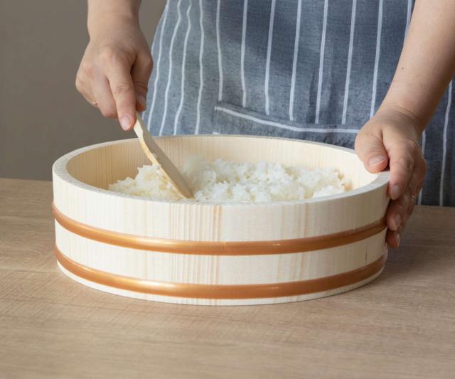 天然木が余分な水分を吸い取るので、ベタつかず美味しい寿司飯ができます。木ならではの優れた保湿性と断熱性で、時間が経っても酢飯の乾燥を防いで程よい温度を保ちます。