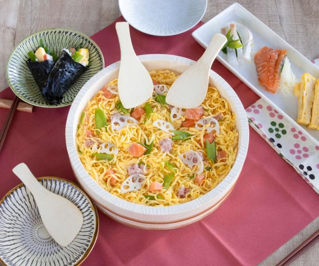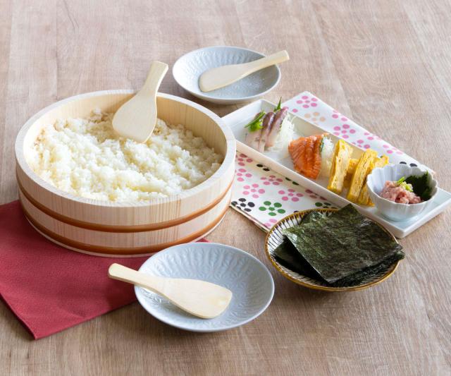 お好きな具材を用意して家族や友人と手巻き寿司が楽しめる、すし桶としゃもじ3本の4点セットです。手巻き寿司だけでなく、ちらし寿司や行事ごとのごちそう作りに最適な寿司桶は、ご家族の集まりやお祝いごとなど特別な日の食卓を彩ります。