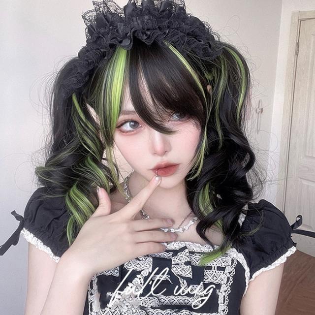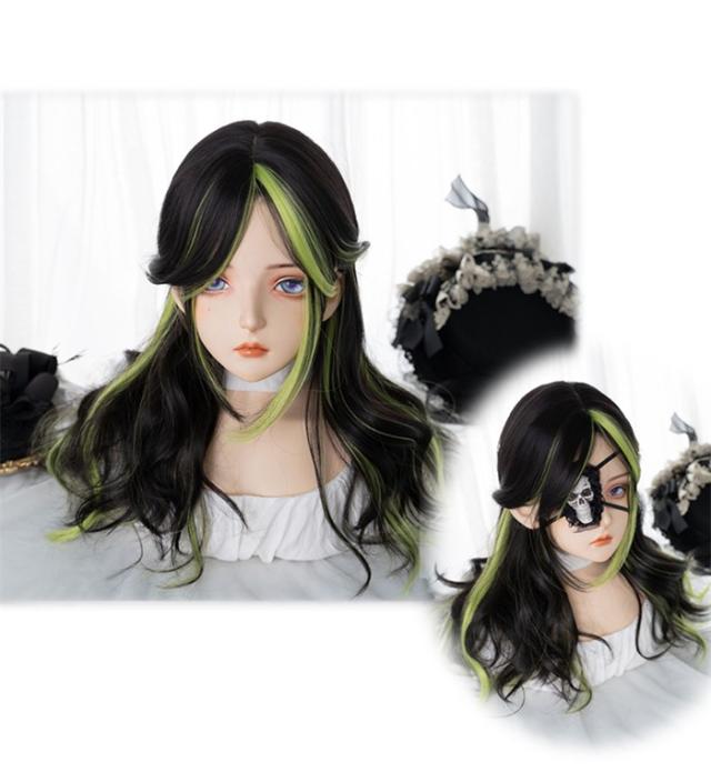 ウィッグ レディース ブラック グリーン フルウィッグ ロング 巻き髪 ぱっつん前髪 前髪あり 可愛い かわいい 大人用 コスプレ ロリータ ゴスロリ コスチューム 原宿風 仮装 超自然 かつら wig Lolita 小顔 文化祭 イベント 学園祭 ハロウィン