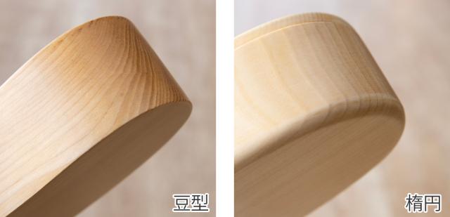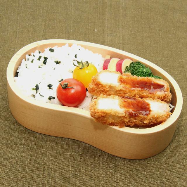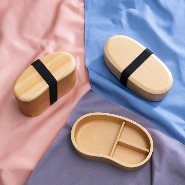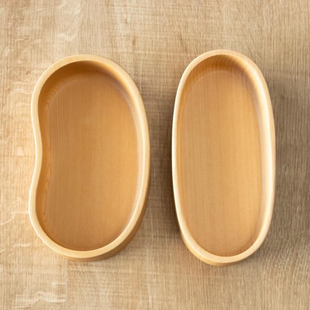 くり抜き弁当箱は豆型と楕円形があり、豆型は置いた時に安定感のある底、楕円は持った時のフィット感があるカーブの付いた底になっています。