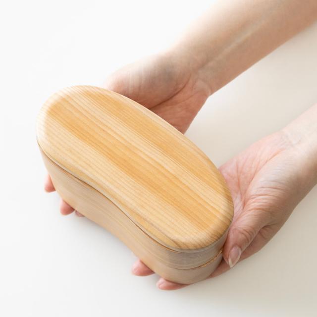 くり抜き弁当箱は豆型と楕円形があり、豆型は置いた時に安定感のある底、楕円は持った時のフィット感があるカーブの付いた底になっています。