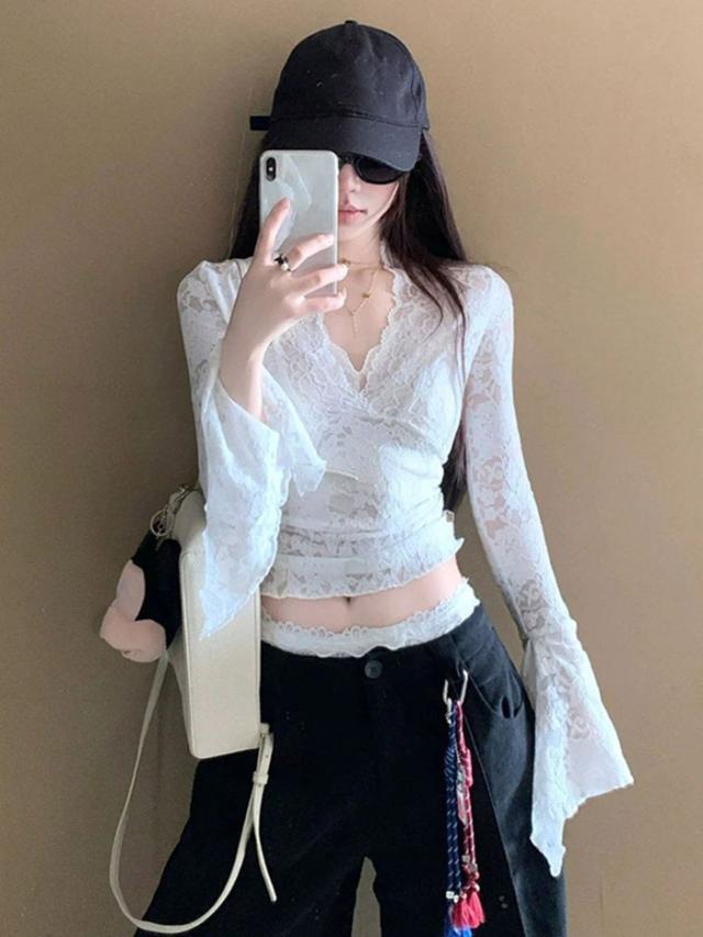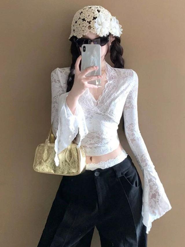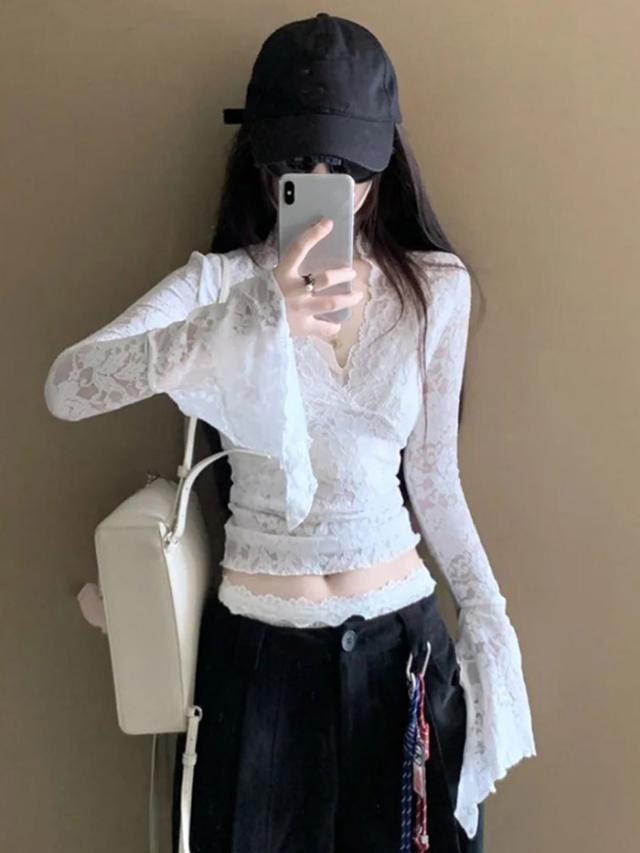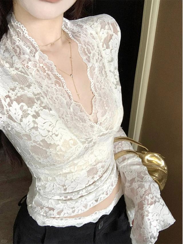 トップス レース セクシー ブラウス 長袖 Vネック インナー 韓国風 大人 可愛い かわいい 秋 冬 春 オフィス 通勤 20代 30代 40代 OL レディース ファッション ぽっちゃり ゆったり カジュアル おしゃれ