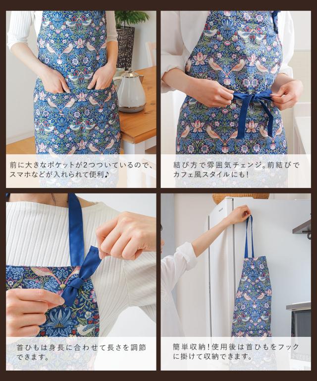 ウィリアムモリス いちご泥棒 エプロン おしゃれ カフェ風 ホルターネック 長さ調整 簡単装着 前ポケット付き クラシカル 上品 華やか お洒落 可愛い かわいい テキスタイル 家事 掃除 炊事 自炊 庭作業 花柄 総柄 モリスワールドコレクション エレガントエプロン 205