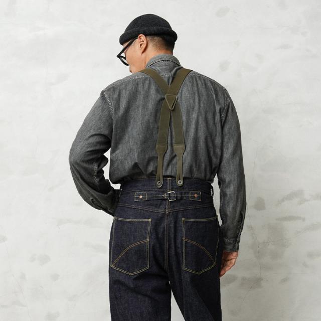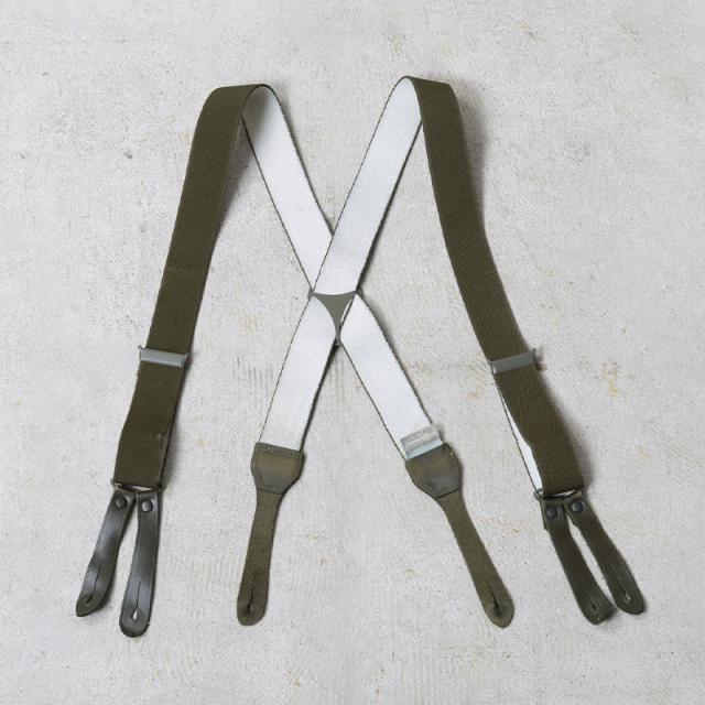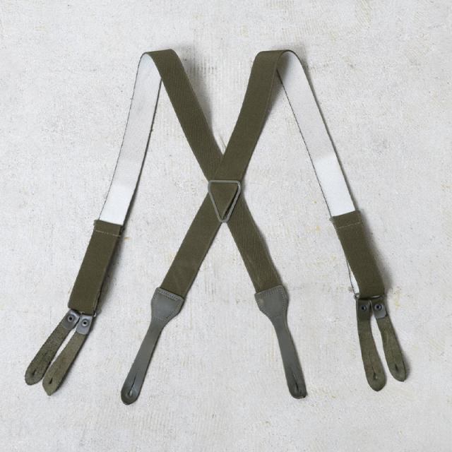 実物 USED ドイツ軍 BW X型サスペンダーのご紹介です。ドイツ連邦軍よりサスペンダーが入荷しました。フロントの留め具が二股に分かれたボタン留めの仕様。先端のタブ部分はレザー製となっており、耐久性に優れ、使い込むほどに馴染んでくれます。バックスタイルがX字になっているので前後均等にパンツを吊り下げるためパンツのラインを美しく見せることができます。 シンプルで伸縮性の高いラバーバンドは使い勝手も良く、コーディネートに取り入れやすいデザイン。またX字の交差している部分で長さも調節可能です。タックパンツに合わせて正装風のスタイルからジーンズスタイルまで幅広く活用でき、ワードローブへストックに備えて置きたい逸品です。