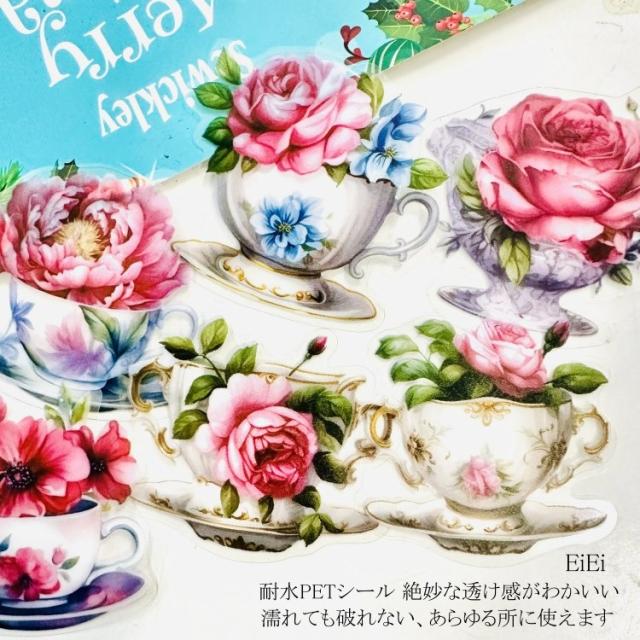 クリアシール おしゃれ ティーカップ イラストシール 洋風 北欧風 ローズ 薔薇 コップ カップ 茶碗 コーヒーカップ イラスト シール PET 耐水 ステッカー 華やか 水彩 コラージュ素材 シール 24枚 デコレーション 花柄 食器 洋食器 デコレーション 手帳 日記 DIY