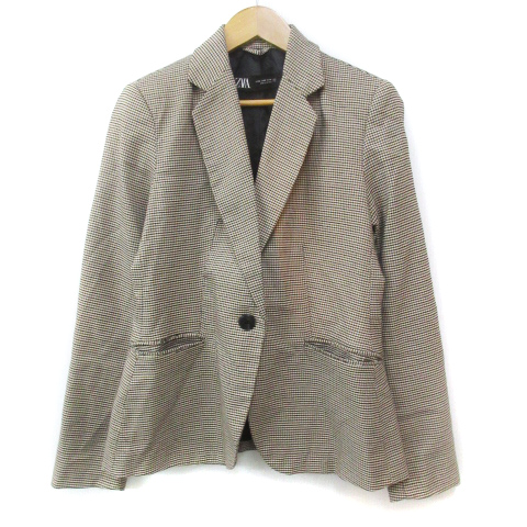 【中古】ザラ テーラードジャケット ミドル丈 総裏地 シングルボタン 千鳥格子柄 36 S ベージュ 黒 レディース