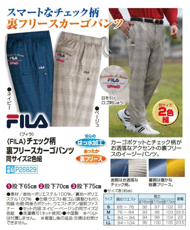 カーゴパンツ イージーパンツ ズボン メンズ フィラ チェック柄 裏フリースカーゴパンツ 2色組 選べる股下丈 紳士服 シニア 男性 ベージュ ネイビー チェック あったかパンツ 暖かい シンプル 撥水加工 40代 50代 60代 70代 80代 父の日 お父さん 秋冬 fri p26829 p28124