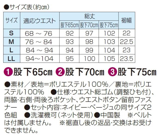 ●仕様/ウエスト総ゴム(調整ひも付)、両脇・右側・両後ろポケット、ウエストボタン留前ファスナー