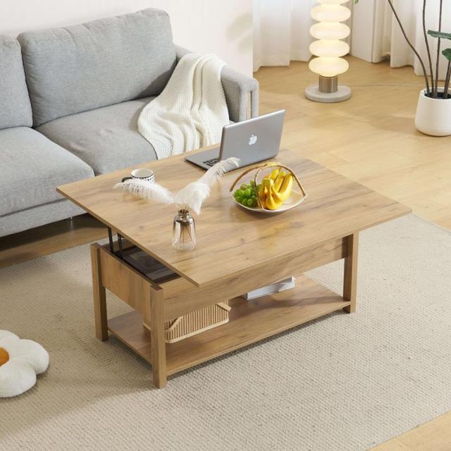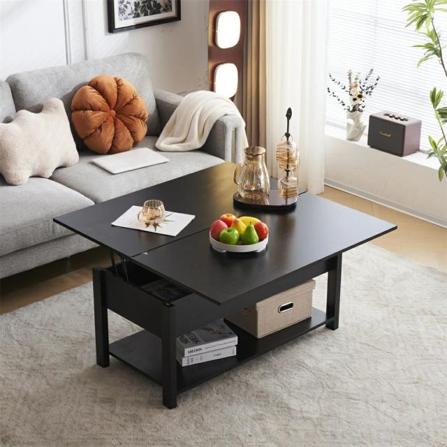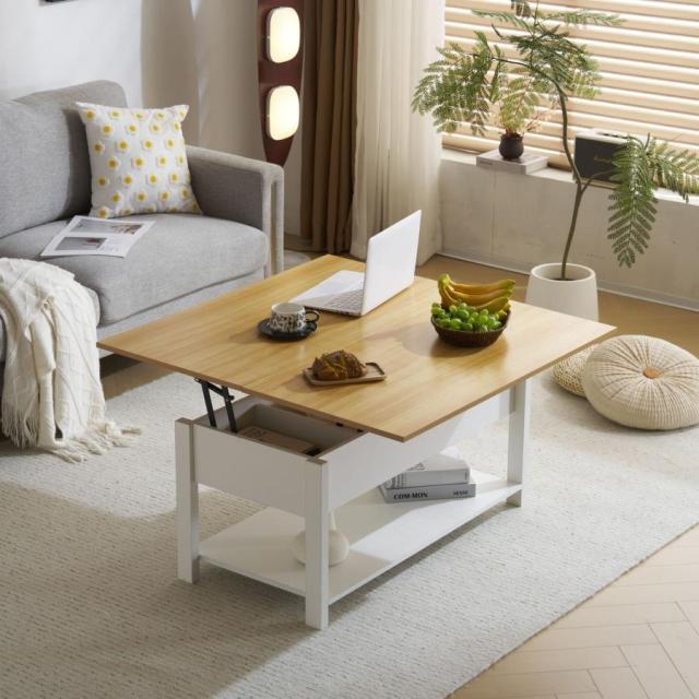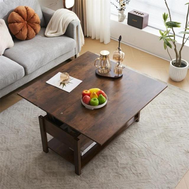 【3WAYモード調節と収納可能】 コーヒーテーブルは、3WAYモード調節機能により、天板が前後に分かれて昇降機能とディスプレイシェルフの組み合わせを特徴とします。天板の高さを調節できるガス圧昇降式。女性でもスムーズにお好みの高さに変更できるペダル式で、約45〜60cmの間で無段階調節が可能です。天板を広げて100 × 100cmの大きなスペースにすることができ、3 ~ 4人で利用可能です。コンパクトで使いやすいサイズ感のテーブル。2人暮らしや、小さいお子様がいるご家庭にもオススメです。