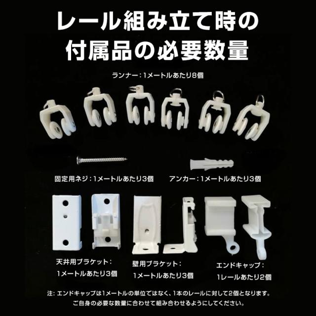 内容物:カーテンレール×1、ランナー×16、固定用ネジ×6、アンカー×6、天井用ブラケット×6、壁用ブラケット×6、エンドキャップ×2,