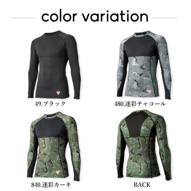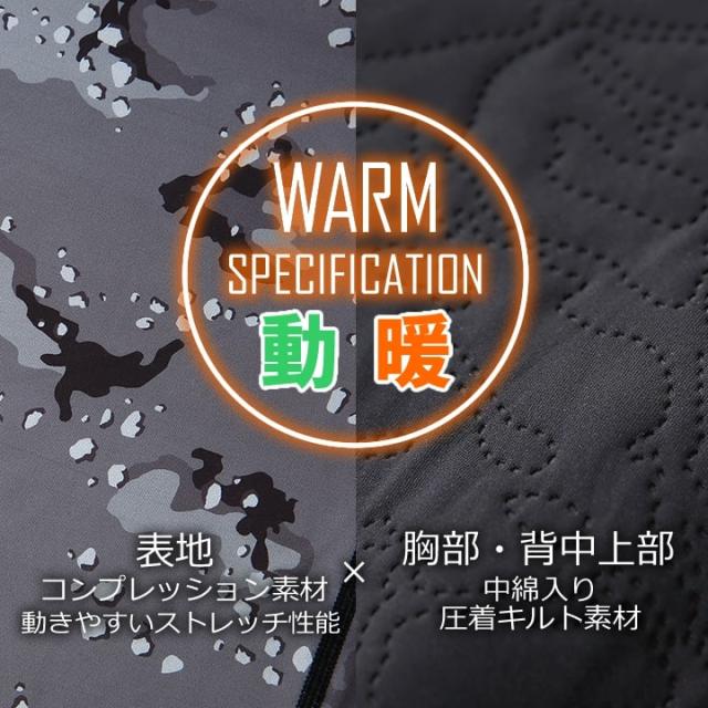 | 説明 特徴 | ワークはもちろん普段着でも!こなれ感あふれるD.GROWシリーズ。 動きやすさと保温性を追求し寒い季節でも快適な長袖防寒インナーシャツ。 胸部・背中上部に中綿入り圧着キルト搭載で保温性抜群。 脇部分はメッシュ素材でムレを軽減し快適に着用可能。 腕部分等はコンプレッション素材で動きやすい仕様。 ありそうでなかった中綿搭載の防寒インナーシャツです。 寒い季節でも暖かく快適に着用できるハイブリッド防寒インナーをお試し下さい。 【特徴】 ● 中綿入り圧着キルトbr> ● 抜群の保温性 ● 高いストレッチ性能 |