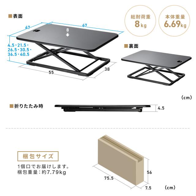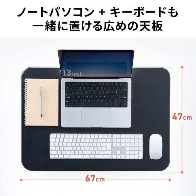 ⇒ご購入の前にご確認下さいお持ちのデスクに設置できる上下昇降が可能なスタンディングデスク。天板左右のレバーで簡単に上下昇降可能。天板幅67cm仕様。厚さ約4.5cmなので、畳んだままでも作業しやすい。ローテーブルとしても使用できるスタンディングデスク。【WEB限定商品】