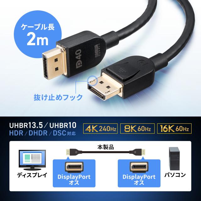 DisplayPort ケーブルDisplayPort ver.2.1 DP40 VESA認証取得 最大16K60Hz DSC圧縮時/UHBR13.5 医療現場 動画編集 ブラック 2m[500-KC046-20]