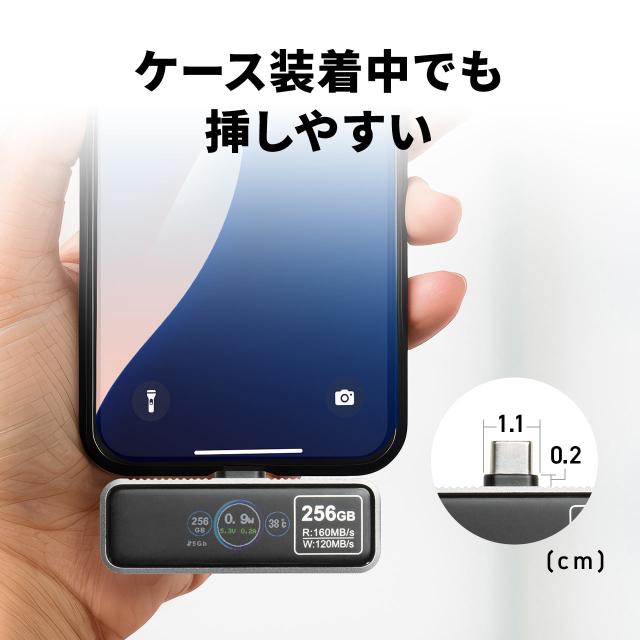 液晶画面付きUSBメモリ スマホ用 Type-C 256GB 電力表示 マグネット式 MagSafe対応 背面取り付け バックアップ 多機能 温度表示 iPhone15 16 シルバー[600-IPCLED256G]