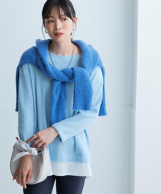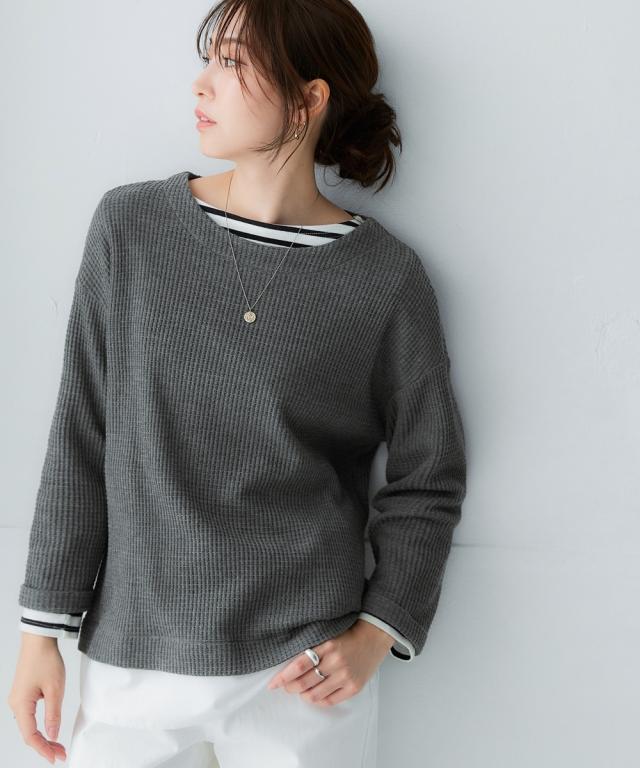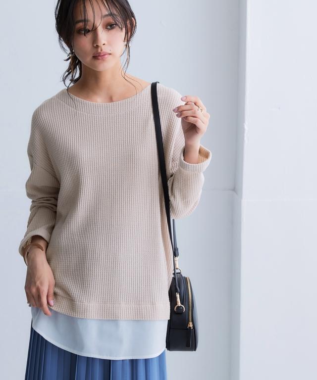 ざっくり編みめが大きい旬のワッフル素材。生地表面に凹凸があるので毛羽立ちが目立ちにくく、キレイをキープしてくれます。ゆったり感のあるプルオーバーにシャツを重ねたようなデザインだから、気楽に着られてサマになるのもうれしい!重ね着風の絶妙な丈感だからヒップや腰回りをばっちりカバーしてくれます。