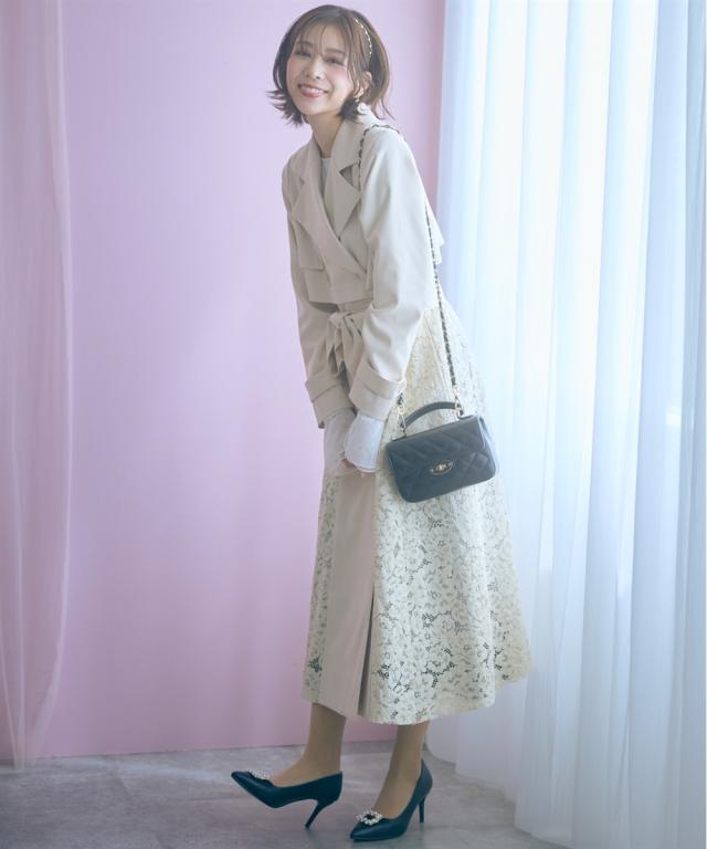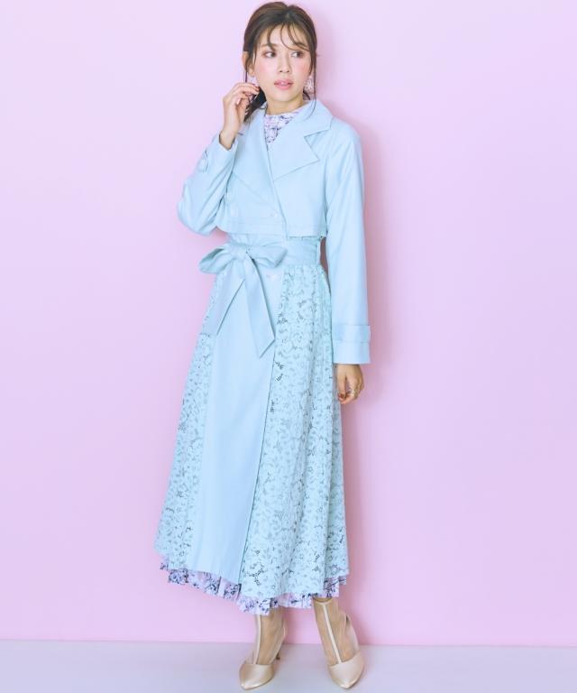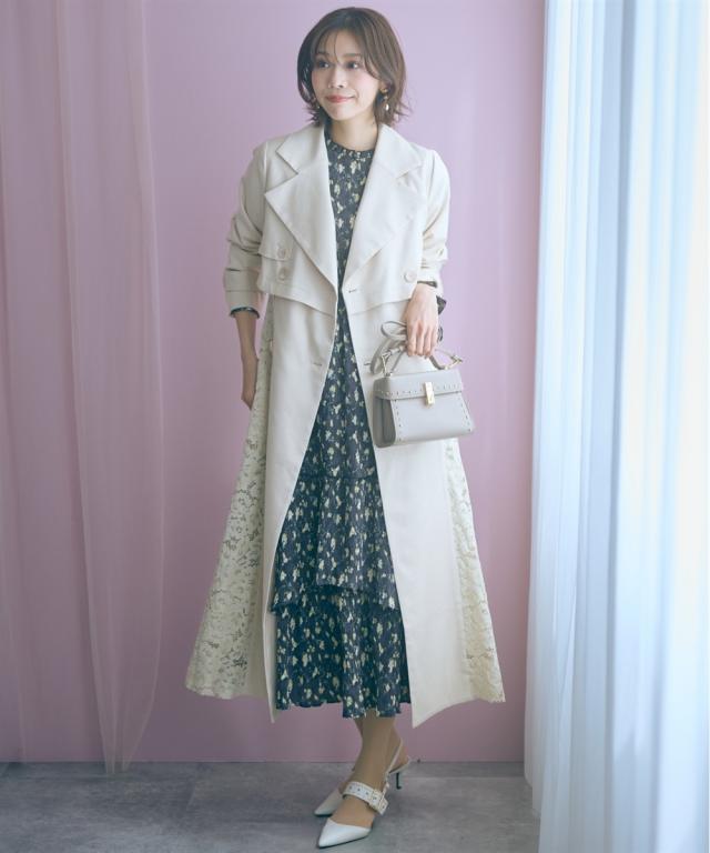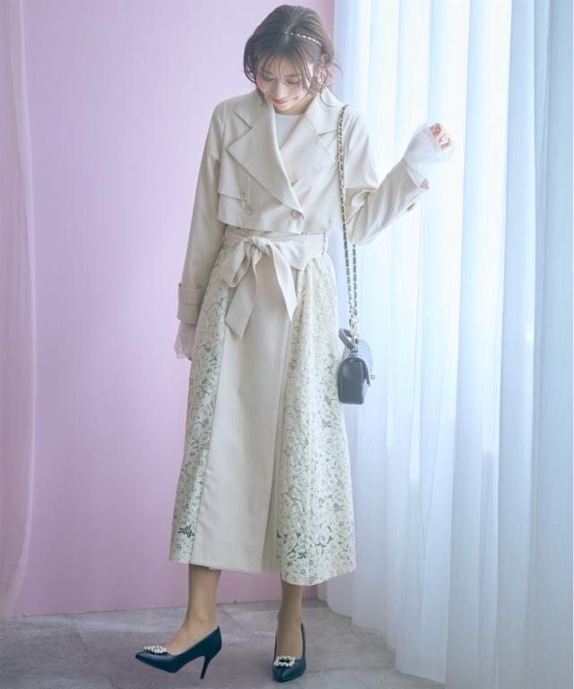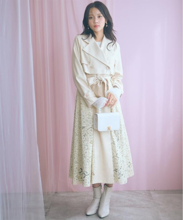 羽織るだけでオシャレ上級者になれるスプリングコート ■デザイン ・レースドッキングがオシャレなコート ・ベルトを閉めて着用しても可愛いシルエットに。 ■素材 柔らかい着心地の素材 ■おすすめのスタイリング ワンピースの上から羽織ったり、ベルトを締めて大人可愛い雰囲気のスタイリングもおすすめ