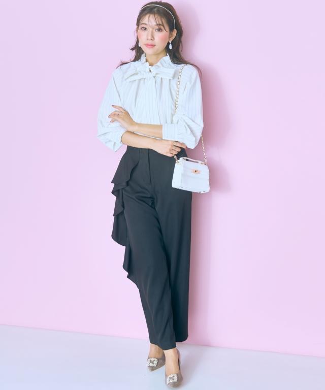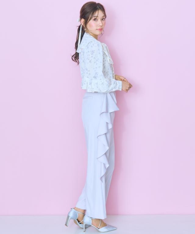 サイドのラッフルデザインが一押しのパンツ ■デザイン ・サイドはラッフルデザインで、前から見てもバランスの良いフリル幅に設定 ・後ろゴムなので着脱楽ちん ・太もも回りもフリルデザインでスッキリみせれるようなデザインにしています。 ■素材 ・さらっとした履き心地の柔らかい素材 ■おすすめのスタイリング ・シンプルなトップス合わせで、ラッフルデザインを効かせたスタイリングがおすすめ