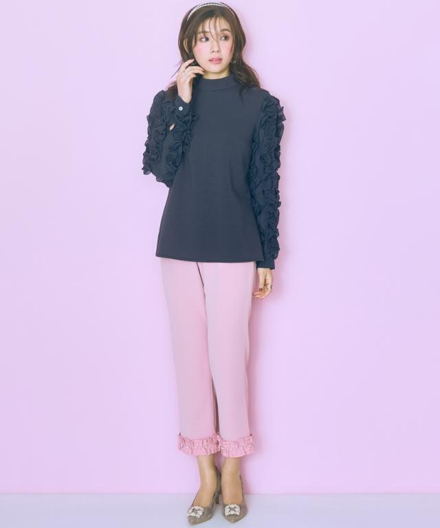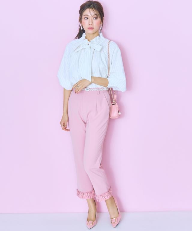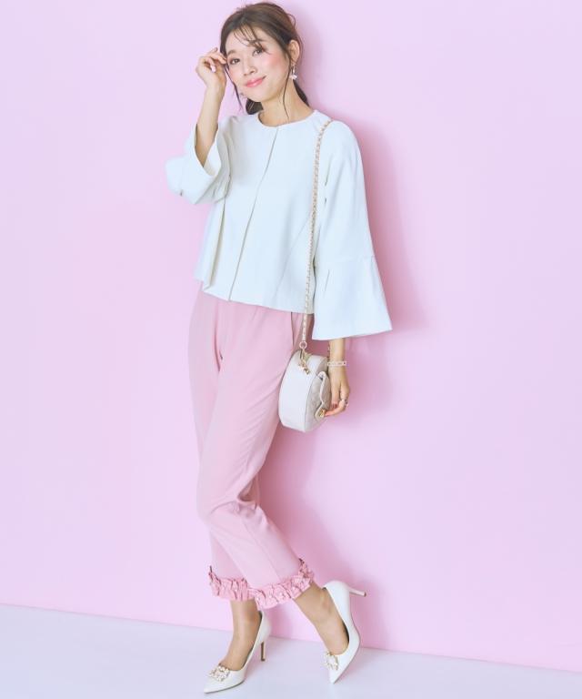 裾パール調がかわいいパンツ ■デザイン ・裾の異素材フリル部分は動いていてもしっかりフリルが立つよう設計 ・360度どこからみてもパール調デザインがさりげなく目立って可愛い ・■素材 ・さらっとした軽い履き心地の素材 ■おすすめのスタイリング ・ざっくりオーバーサイズのものと合わせて、裾パール調をアクセントにみせるスタイリングがおすすめ