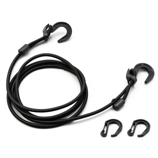 荷物の量に合わせてコードの長さを調節できるバイク用ストレッチコード 【仕様1】コードは程よい伸縮性と耐久性を両立させたΦ6.5mmのゴム製。 【仕様2】シンプルな調節構造だから、荷物の抑え加減を簡単に調節できます。 【仕様3】コードエンドにミニフックを付けることで、余ったコードを共締めすることができます。 【仕様4】商品構成:本体、調整式フックx2、中間フックx2