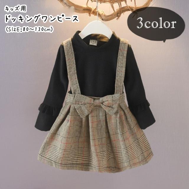ドッキングワンピース キッズ 子供服 子ども服 女の子 フェイクツーピース フェイクレイヤード 重ね着風 ハイネック 長袖 Aラ