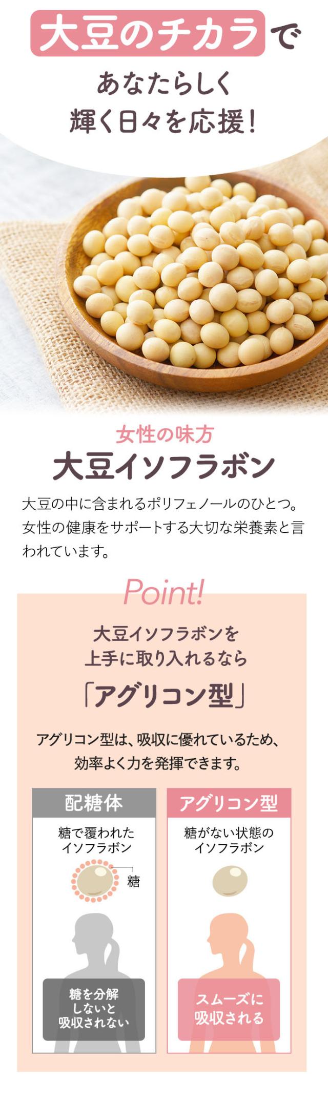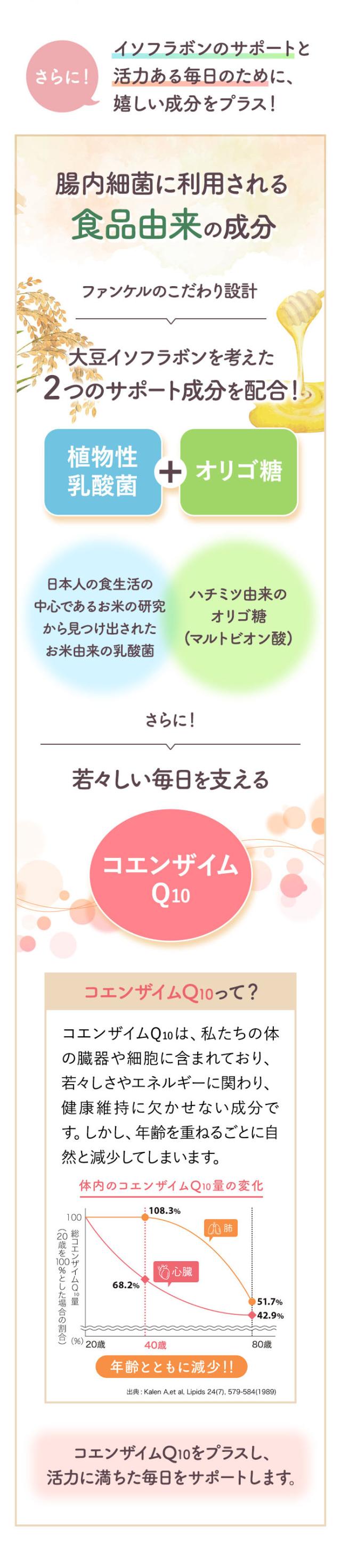 大豆イソフラボンアグリコン:25mg、植物性乳酸菌:500億個、オリゴ糖(マルトビオン酸として):13mg、コエンザイムQ10:10mg