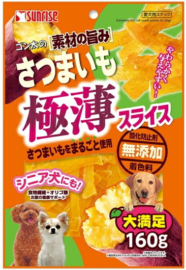 オリゴ糖とさつまいもに含まれる食物繊維でワンちゃんのお腹の健康サポート。極薄タイプのスナックだから柔らかく、シニア犬にも与えやすいさつまいもスナック。