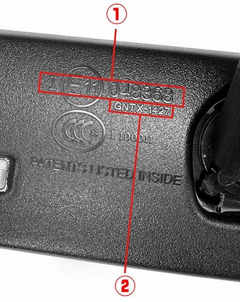 ※本製品の適合は、純正ルームミラー裏面に表示されている「ECE認証番号」もしくは「GENTEX No.」で確認します。 車種・型式・年式が同じ場合でも、車両により純正ミラーが異なる場合がありますので、必ず下記のいずれかの番号が合致することを確認してください。
