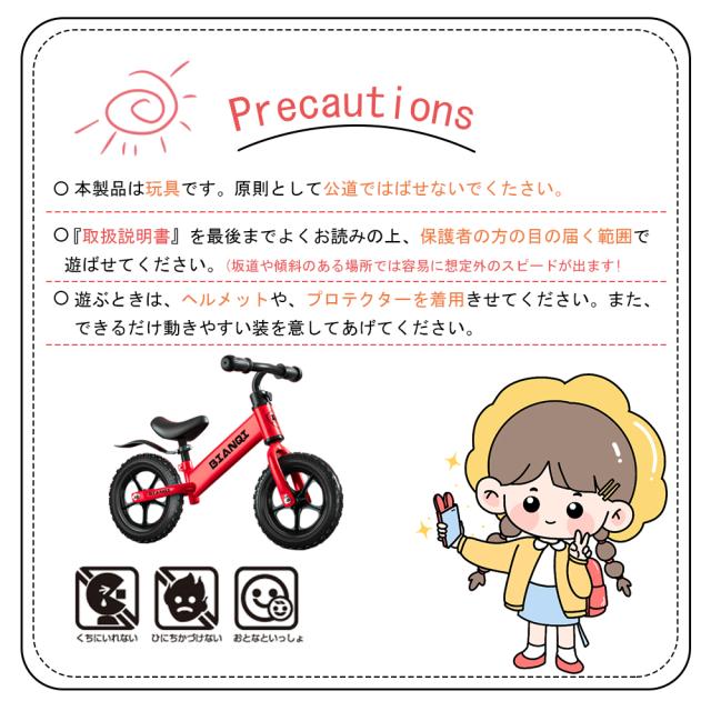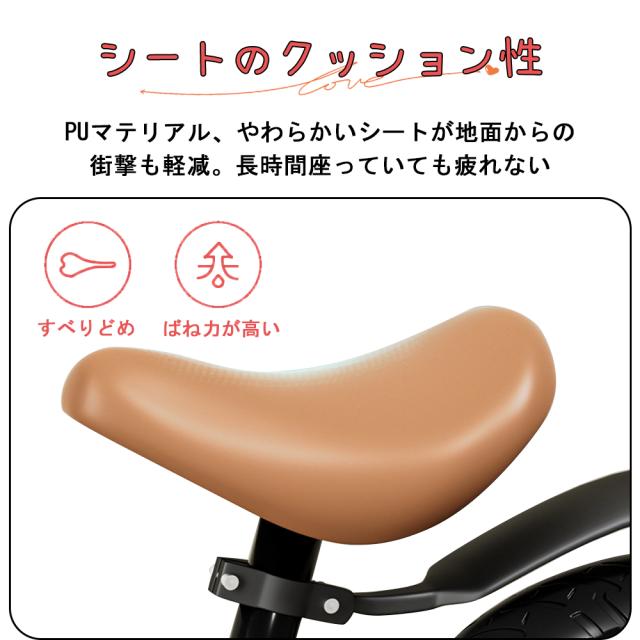 【安全な設計】グリップエンドは衝撃吸収性が高く、転倒時の衝撃を和らげお子様の手をしっかり守ります。高品質のノーパンクタイヤ装備、メンテナンス不要で、耐久性に優れる!地面からの衝撃も抑えるます。【快適な体験】クッション性に優れたサドルで、乗り心地がいい。衝撃低減効果も抜群!シート形状も人間工学に基づいた形状で、子供に快適なサイクリングをサポートします。砂利や小石の多い公園、荒れた悪路でも、子供たちは楽しく乗ることができます。【360度回転可能ハンドル】転倒してハンドルバーが体にぶつかった時の衝撃を緩和してくれます。【超軽量 ポータブル】金属の使用を減らし、2kgの圧倒的な軽さを実現しました。子どもが一人でも扱いやすく、持ち運びも簡単なので気軽に遊びに行けます。持ち手付きでが付いているので、持ち運びに便利です。ご注意1 安全のため、公道や坂道で乗らないでください。2 転倒した場合の頭部の衝撃やケガを減らすために、使用時は幼児用ヘルメットを着用してください。3 危険な使い方をしないよう、保護者の方は子供から目を離さないようにしてください。