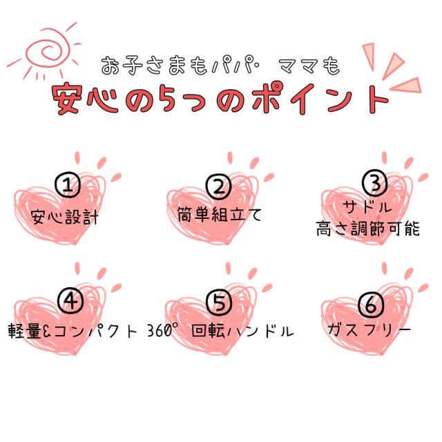 グリップエンドは衝撃吸収性が高く、転倒時の衝撃を和らげお子様の手をしっかり守ります。高品質のノーパンクタイヤ装備、メンテナンス不要で、耐久性に優れる!地面からの衝撃も抑えるます。