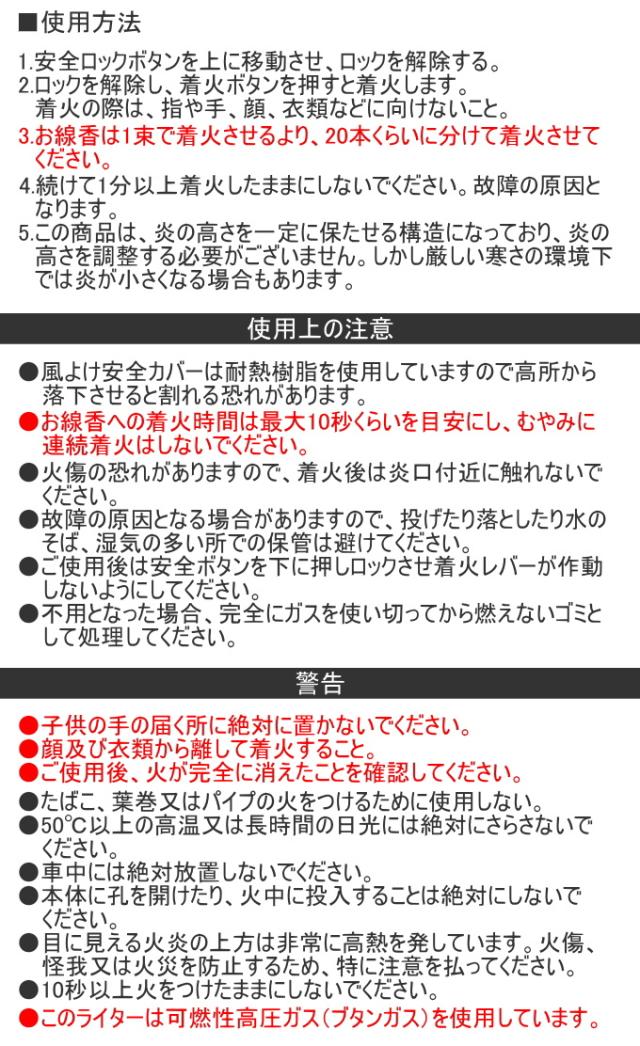 ●着火時間は最大10秒くらいを目安に使用してください。 ●連続的に何回も着火させますと故障の原因となりますのでおやめください。 ●車中に入れっぱなしにしたり、高温になるようなところで保管しないでください。 ●可燃性高圧ガス(ブタンガス)を使用しています。 ●お線香は1束で着火させるより、20本前後を扇状にして、中心から着火させると早く全体に火が届きます。 |
