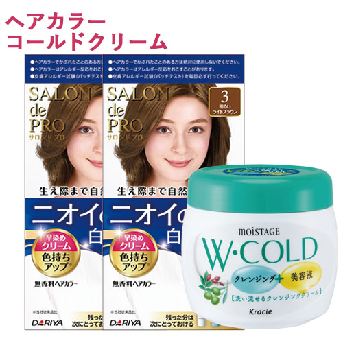 サロンドプロ 無香料ヘアカラー 早染めクリーム 白髪用 3 明るいライトブラウン 2個&モイスタージュ Wコールドクリーム 270g SALON de PRO ダリヤ(DARIYA) MOISTAGE クラシエ(Kracie)【送料込】