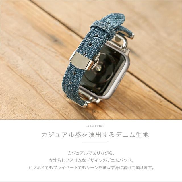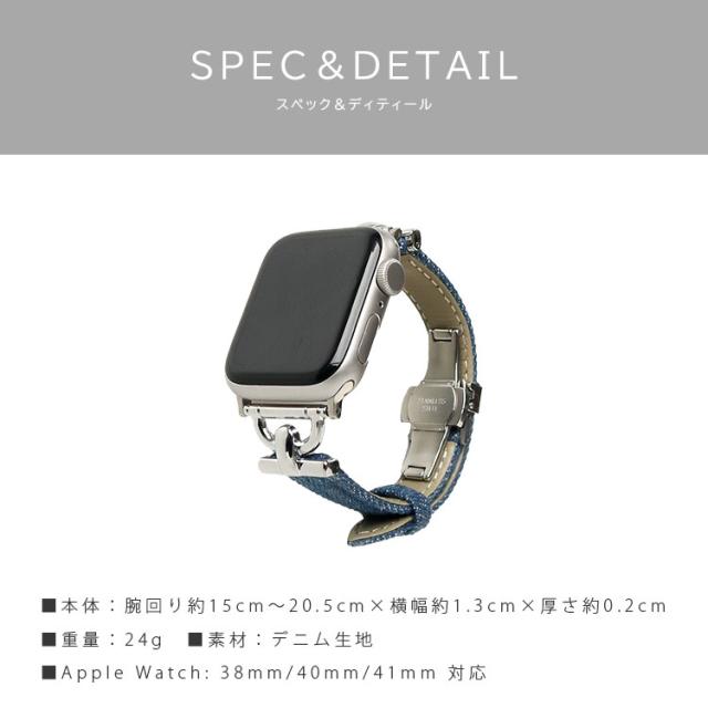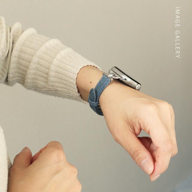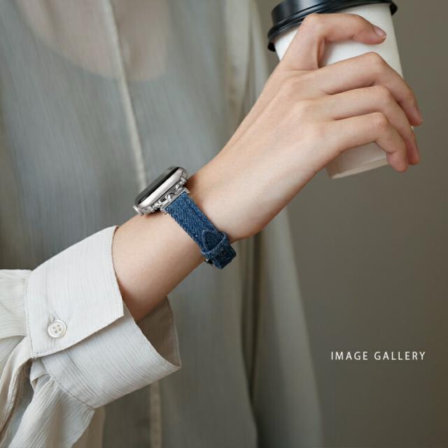 デニム生地とシルバーの装飾を組み合わせた、洗練されたアップルウォッチ用バンドです。細身のデザインが手首を華奢に見せ、上品で大人っぽい印象を演出します。