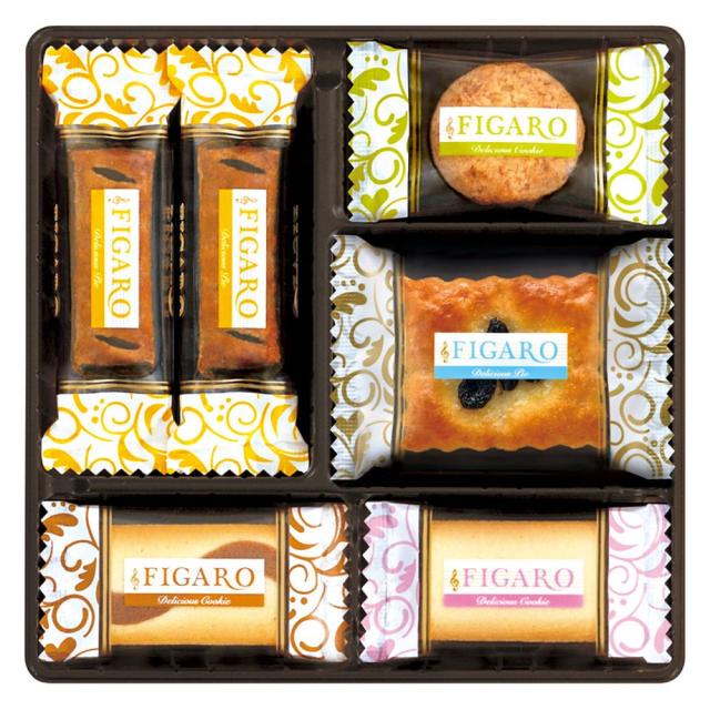 【商品名】 フィガロ 【内容】チョコレートパイ・サンドクッキー チョコレート・ホワイトチョコ ×各4、レーズンパイ・ココナッツクッキー×各3 【賞味期限】常温10ヶ月 (表示期限の半分以上) 【アレルゲン】卵・乳・小麦
