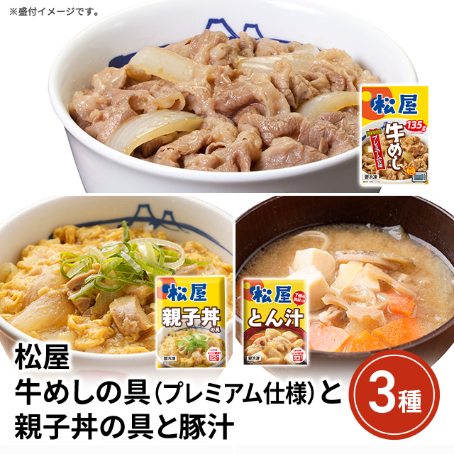 ・人気の牛めしの具(プレミアム仕様)、親子丼の具、豚汁を楽しめるセットです。