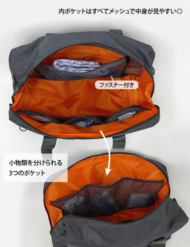内側のメッシュ3オープンポケットは化粧品や洗面用具、充電器、肌着などを仕分けて収納しやすく、