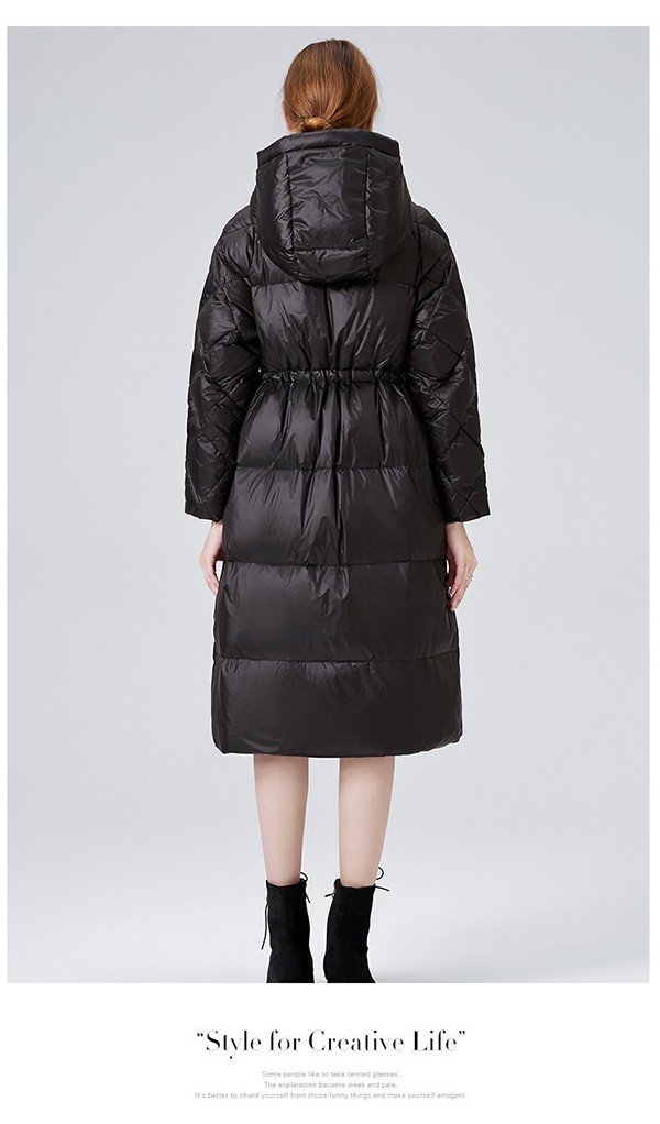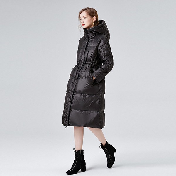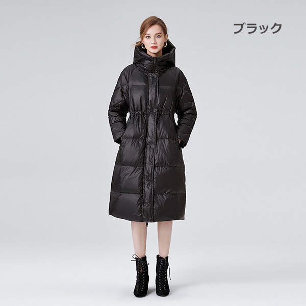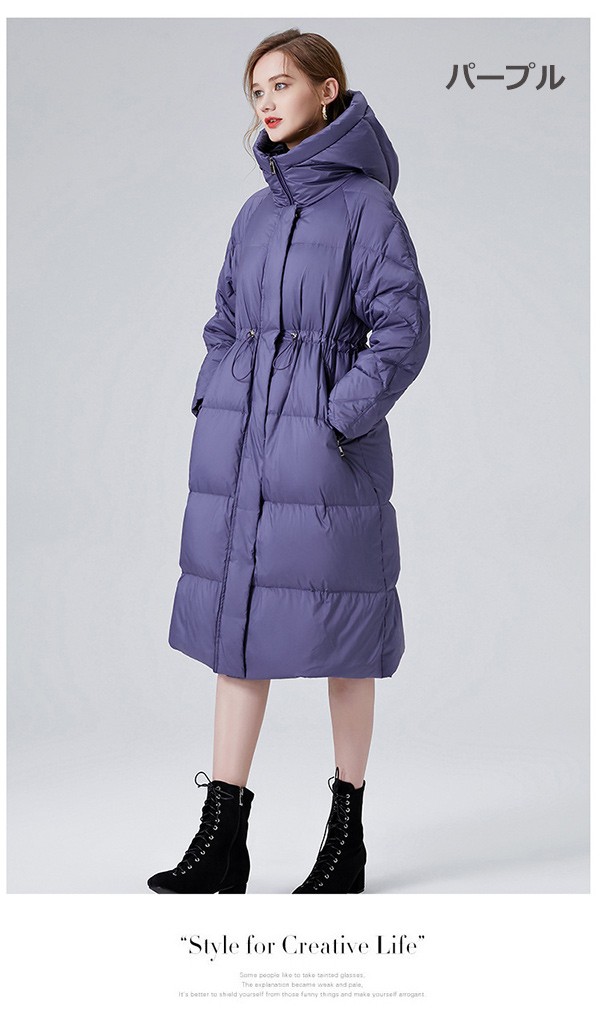 ダウンコート レディース ロング ダウン90% 防寒 フード付き ウエストシェイプ ウエストマーク パープル 紫 ブラック 黒 ハイネック スタンドネック アウター ロングコート ポケット付き 冬 おしゃれ シンプル 寒さ対策 柔らかい 暖かい