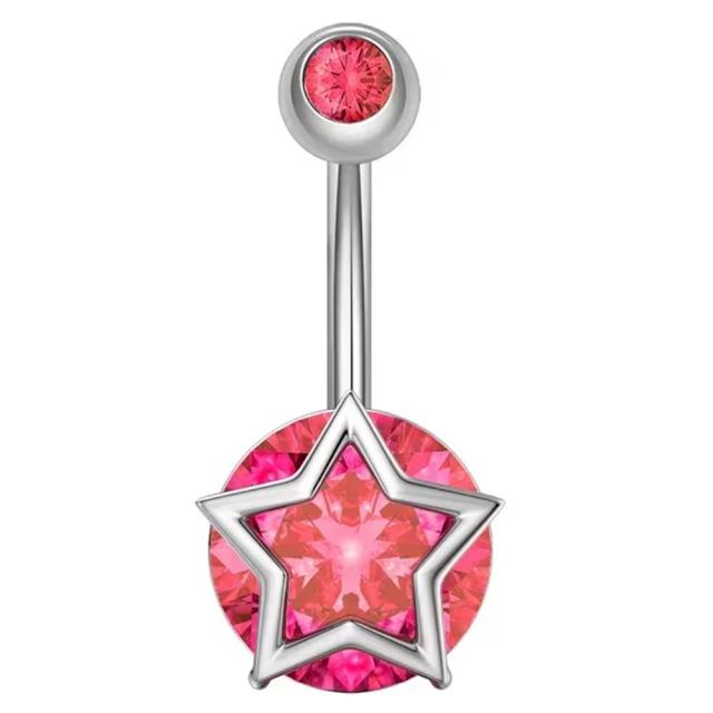 大きなピンク色のジュエルに星をデザインしたシンプル綺麗な14ゲージのカーブバーベル型ボディピアス。