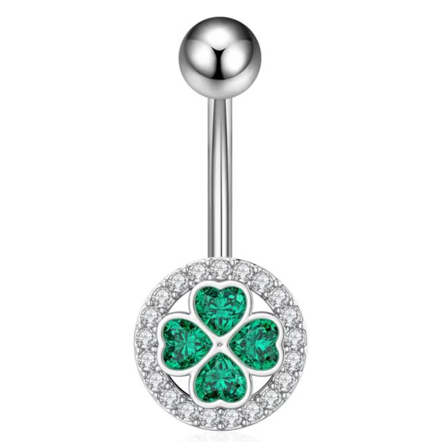 [14G ボディピアス ヘソピアス] ハートフルリングクローバー へそピアス 1個販売 14ゲージ メンズ レディース サージカルステンレス316L カーブバーベル バナナバーベル ボディーピアス 臍ピアス プレゼント ギフト ヨツバ 四つ葉 四葉 グリーン 緑色 ストーン ジュエル 石