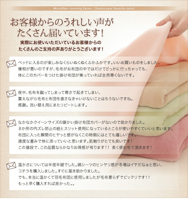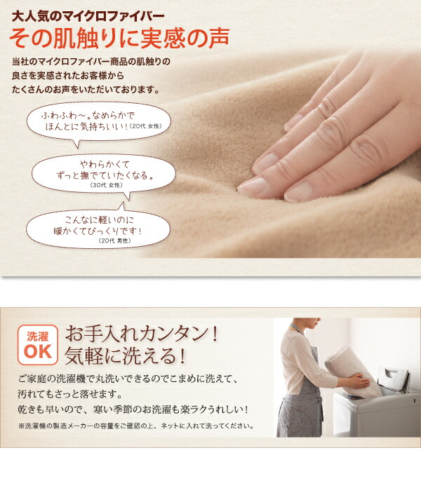 マイクロファイバーは、そのヒンヤリを防いで布団に入った瞬間から、ふわふわの暖かさを感じられます。「