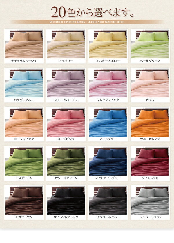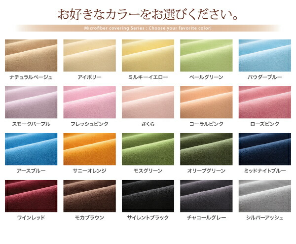 アイボリー 乳白色、ローズピンク、コーラルピンク、ペール緑 グリーン、パウダー青 ブルー、サイレント黒 ブラック、ミッドナイト青 ブルー、サニーオレンジ、モス緑 グリーン、シルバーアッシュ、ワイン赤 レッド、モカブラウン、ナチュラルベージュ、ミルキー黄色 シリーズ通算150.000人突破!マイクロファイバーシリーズ