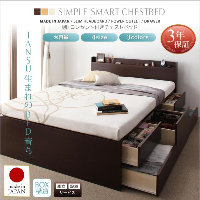 シングルベッド 茶色 ダークブラウン 茶 こげ茶、ナチュラル、白 ホワイトから選べる 茶色 ダークブラウン 茶 こげ茶、ナチュラル、白 ホワイトから選べる ベッド 収納付きベッド マットレス付き 収納 収納付 収納ベッド 大容量 収納ボックス 布団 敷き布団 おしゃれ 国産BOXタイプ・棚・コンセント付きチェストベッド