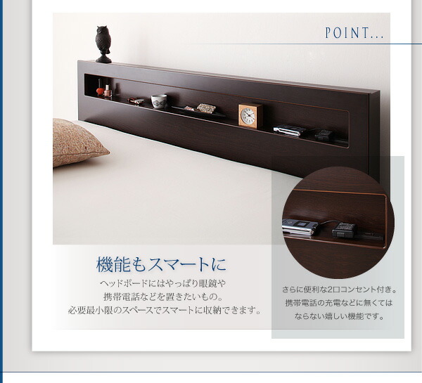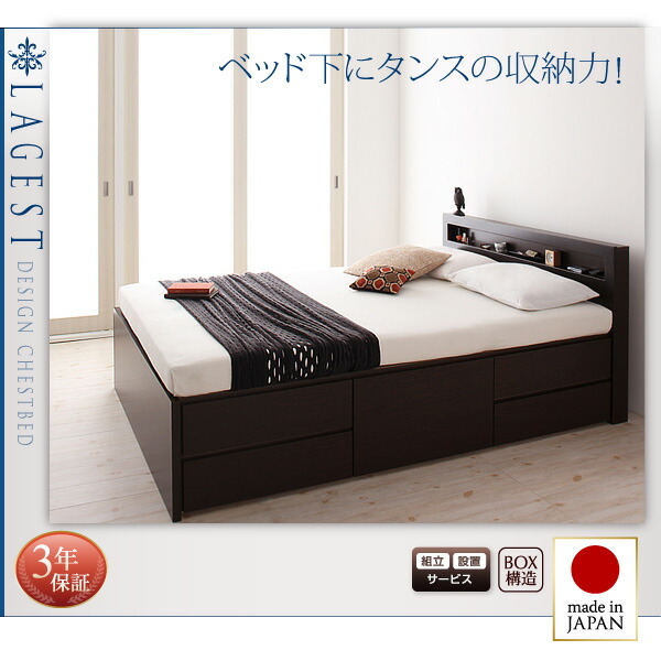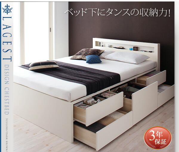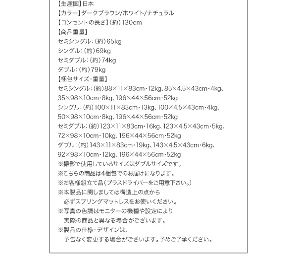 シングルベッド 茶色 ダークブラウン 茶 こげ茶、ナチュラル、白 ホワイトから選べる お客様組立 棚・コンセント付きチェストベッド 薄型プレミアムボンネルコイルマットレス付き
