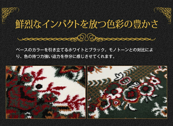 目を引く圧倒的な存在感。モチーフを美しく表現する色の鮮明さが豪華に彩ります。この重厚感あふれるデザインを鮮明に表現するためにウィルトン織りを採用しました。