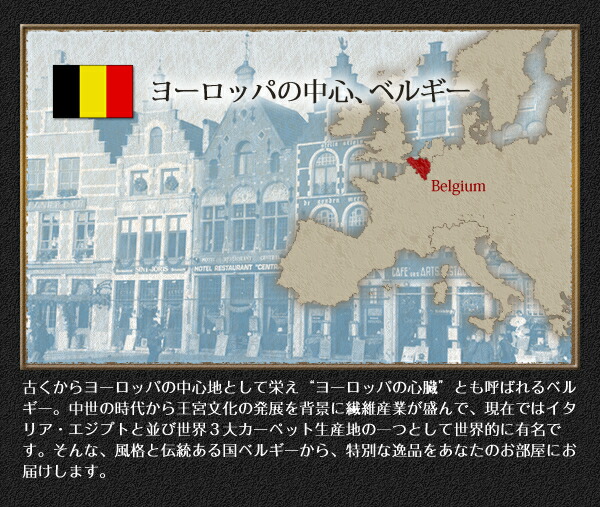 "古くからヨーロッパの中心地として栄え“ヨーロッパの心臓”とも呼ばれるベルギー。中世の時代から王宮文化の発展を背景に繊維産業が盛んで、現在ではイタリア・エジプトと並び世界3大カーペット生産地の一つとして世界的に有名です。