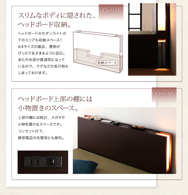 スリムなボディに隠された、ヘッドボード収納・・ヘッドボードのモダンライトの下のエリアも収納スペース!