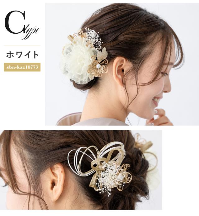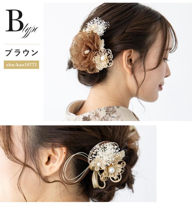 髪飾り 3点セット レディース 成人式 卒業式 ベージュ ブラウン ホワイト 花 オーガンジー フェイクパール かすみ草 水引 ヘアアクセサリー 送料無料