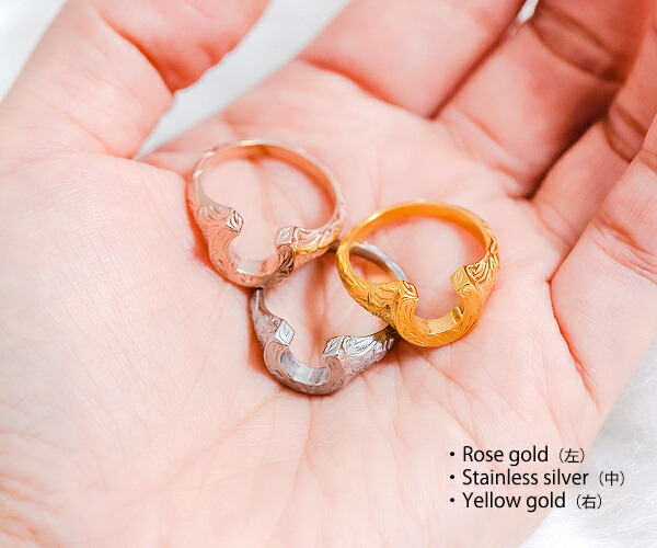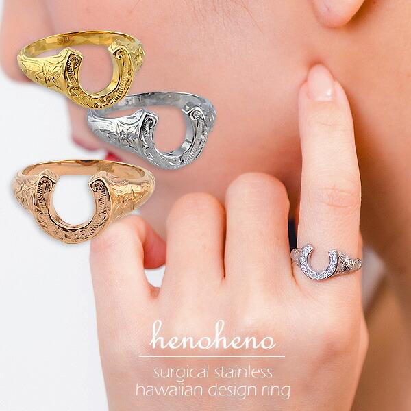ステンレス リング ハワイアンジュエリー 指輪 金属アレルギー対応 馬蹄 ホースシュー プルメリア スクロール レディース つけっぱなし 重ねづけ サージカルステンレス 大人 メンズ 大きいサイズ ローズゴールド シルバー イエロー henoheno