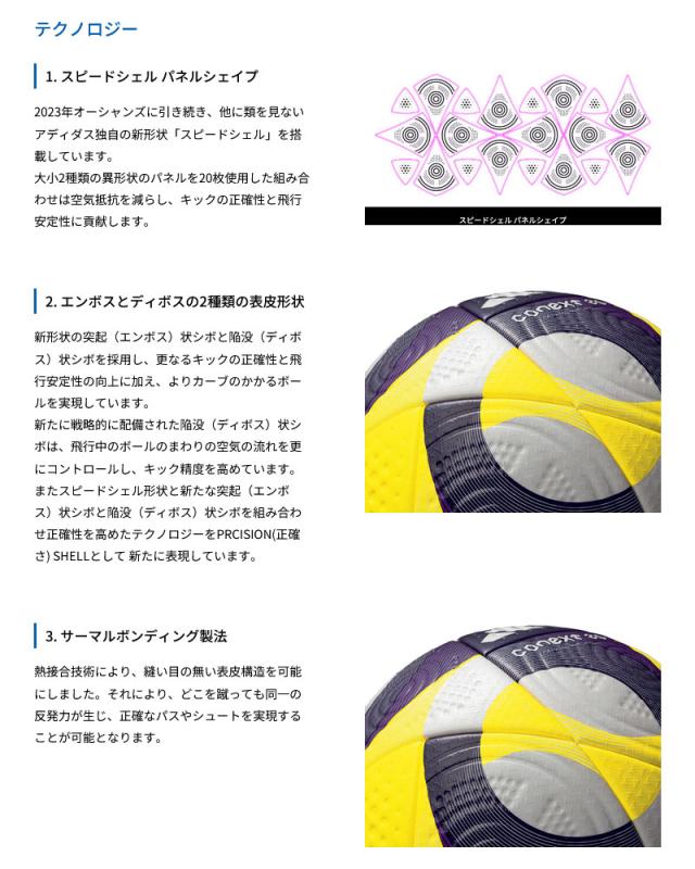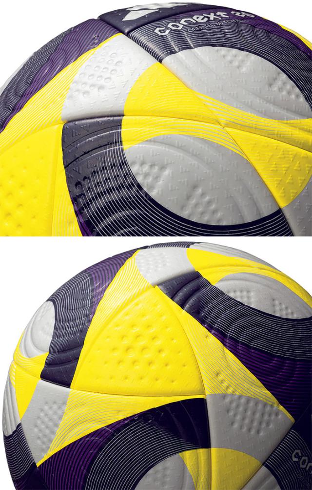 新形状の突起(エンボス)状シボと陥没(ディボス)状シボを採用し、更なるキックの正確性と飛行安定性の向上に加え、よりカーブのかかるボールを実現しています。