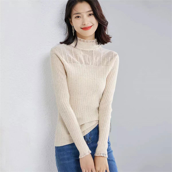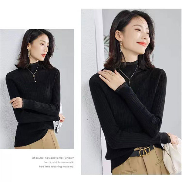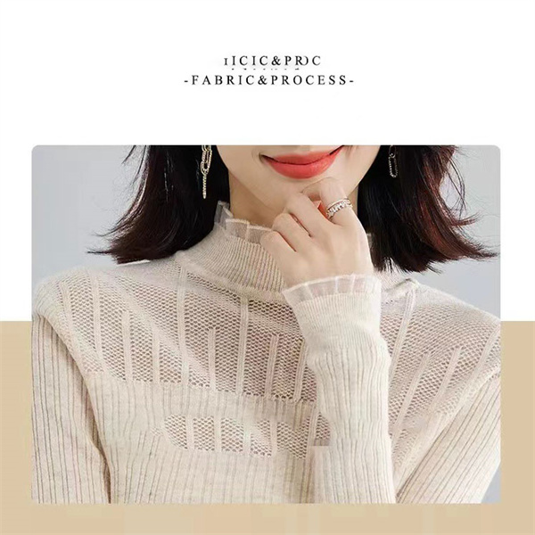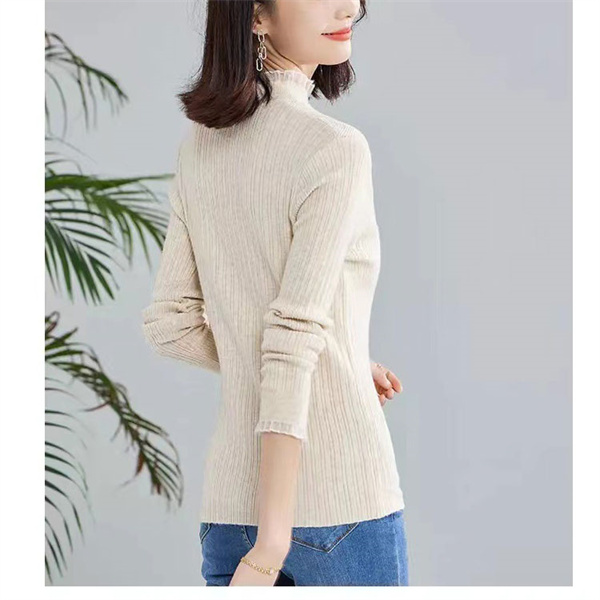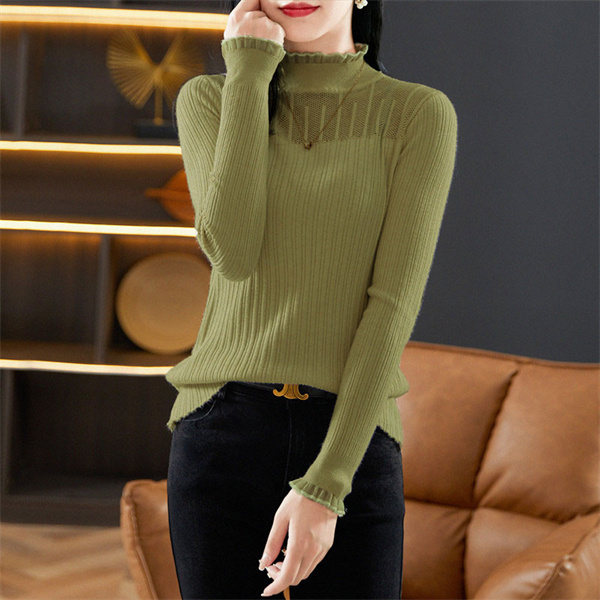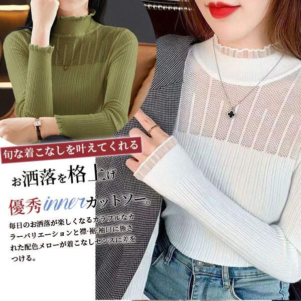 値下げ シェア リブカットソー インナー レディース 長袖 フリル袖 おしゃれ ハイネック リブカットソー 無地 小顔効果 伸縮性 通勤 通学